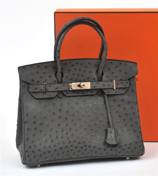 The 30cm handbag in graphite ostrich leather and silver metal hardware, with original box.