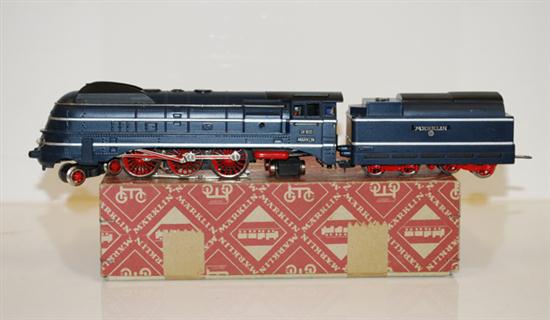 MARKLIN LOCO SK 800 N TYPE 14, CIRCA 1949, DARK BLUE WITH BLACK, SILVER TRIM, WITH PAMPHLET (E BOX E)