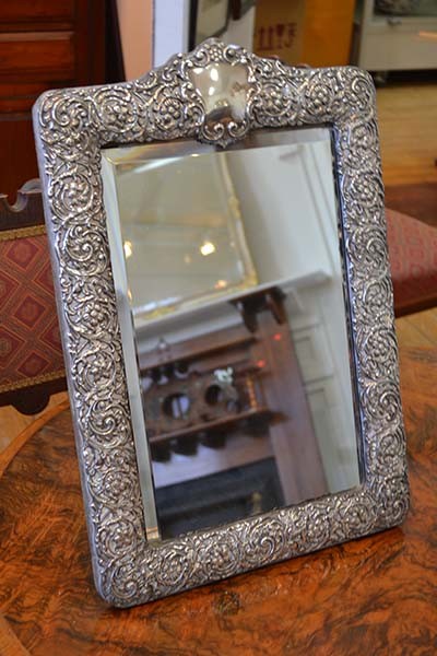 LARGE BIRMINGHAM STERLING SILVER EMBOSSED TABLE MIRROR, MARKERS MARK FOR W.H.W