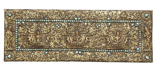 A TIBETAN GILT COPPER REPOUSSE ON WOOD BOOK COVER, 16TH CENTURY