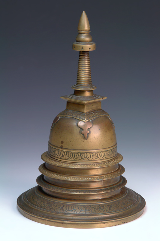 A 19TH CENTURY BRONZE SRI LANKAN RELIQUARY STUPA, incised floral and foliate motifs around base & body, with four Bodhi-leaf shapes to centre, a lotus bud finial 25cm high