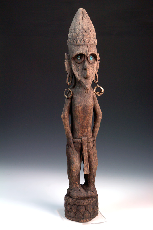 A KALIMANTAN DAYAK ANCESTOR FIGURE, conical headress, pendulous ears with iron earrings, a spike rising from chin, carved loincloth, hands on thighs, at back a totem lizard, loss to forehead 63.5cm high