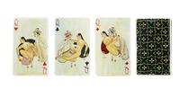 Fifty four cards, each hand painted with erotic depictions and suits with repeated pattern verso, each card 9cm x 5.5cm.