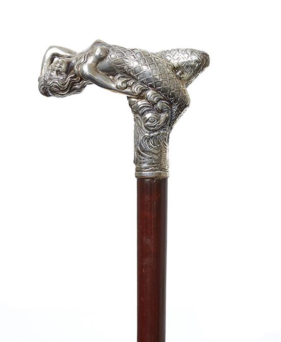 The 800 silver handle depicting a recumbent mermaid supported by waves, the tapered shaft with silver ferrule, probably made in Schwabisch Germany, approximate weight of handle 250 grams, 90cm long.