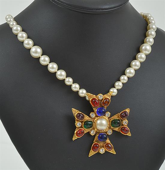 The cross shape pendant set with multi-coloured gripoix glass in gold metal, circa 1980, suspended from a strand of pearls, with box.