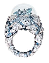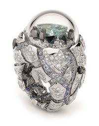 Centrally set with a lace agate pool of ice with a dreamscape cut aquamarine iceberg above, having two penguins and diamond detail to the edges, encased in a synthetic sapphire dome, mounted in an elaborate frame set with round brilliant cut diamonds totalling 2.50cts and blue sapphires of graduated hues totalling 8.00cts, mounted in 18ct white gold, ring size S.