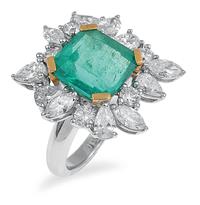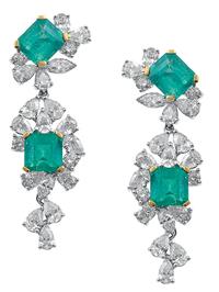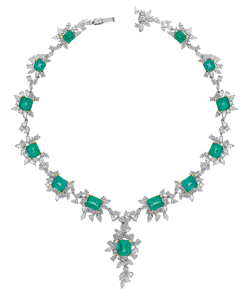 Comprising a necklace, earrings and ring, the necklace featuring thirteen clusters set with graduated emerald cut emeralds totalling 51.14cts, surrounded by round, pear and marquise cut diamonds totalling 47.33cts, all set in 18ct white and yellow gold, total length 420mm, the drop earrings each set with two emerald cut emeralds totalling 6.13cts, surrounded by round, pear and marquise cut diamonds totalling 4.77cts, all set in 18ct white and yellow gold and the cluster ring centrally set with an emerald cut emerald of 6.94cts, surrounded by round, pear and marquise cut diamonds totalling 3.56cts, mounted in 18ct white and yellow gold, ring size M.