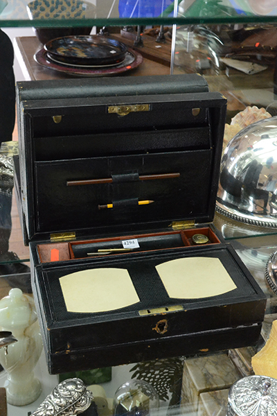 A LEATHERBOUND VICTORIAN WRITING SLOPE 'S. NEAVERSON, 1886' INSCRIBED TO BRASS MOUNT
