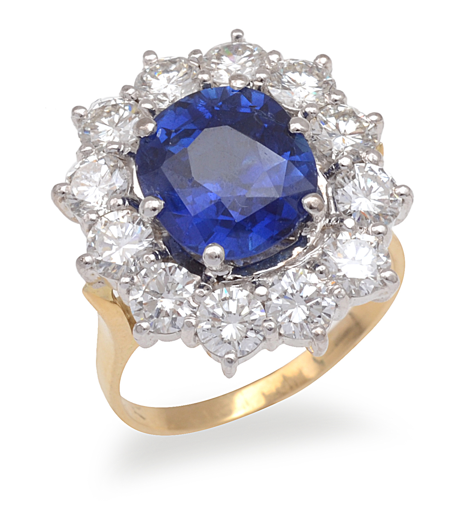 Centrally set with an oval sapphire of 3.49cts, surrounded by twelve round brilliant cut diamonds totalling 1.97cts, mounted in 18ct gold, ring size K.