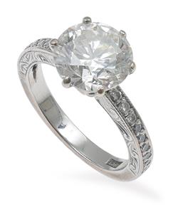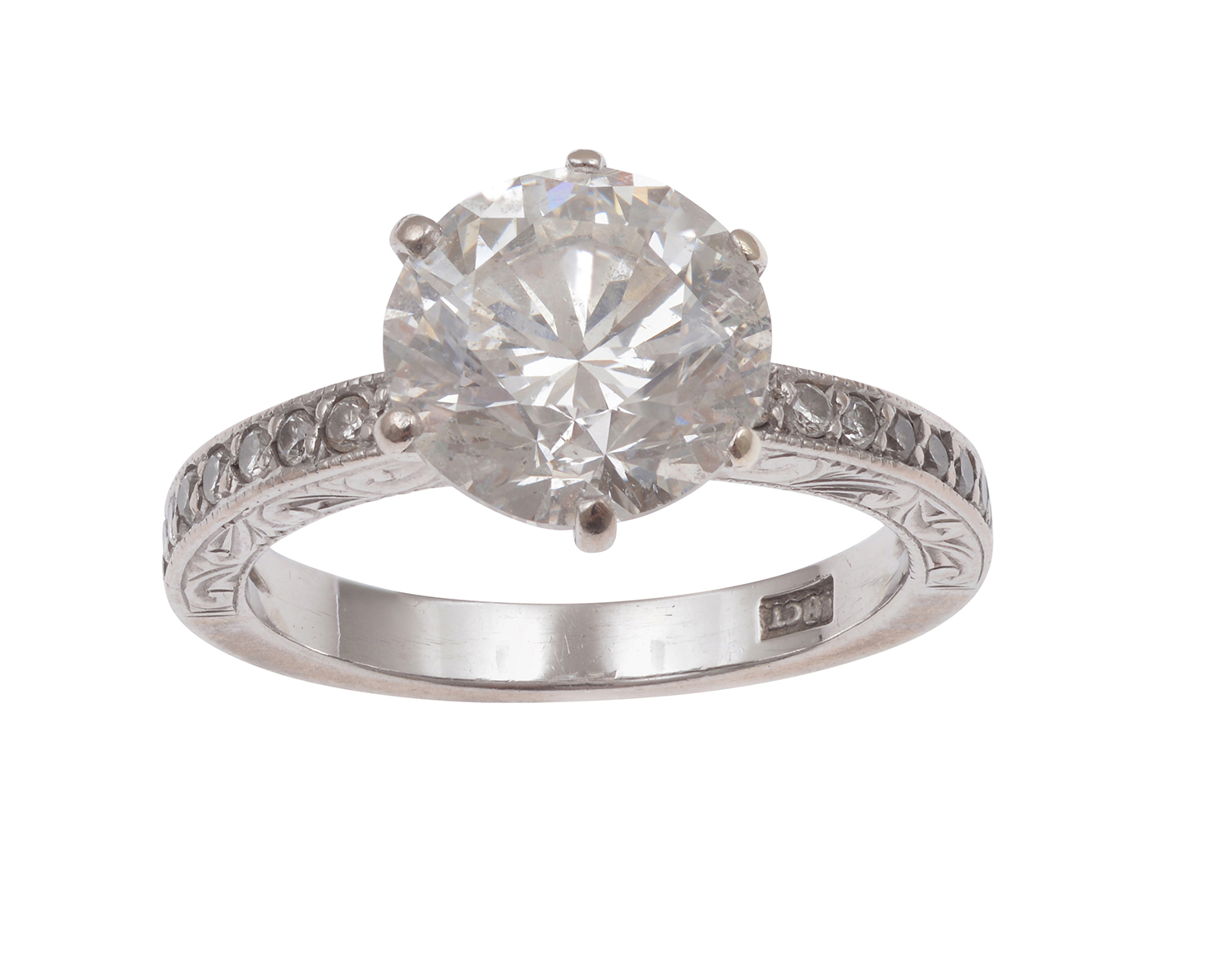 The round brilliant cut diamond of 3.05cts raised above diamond set shoulders, mounted in 18ct white gold, ring size K.