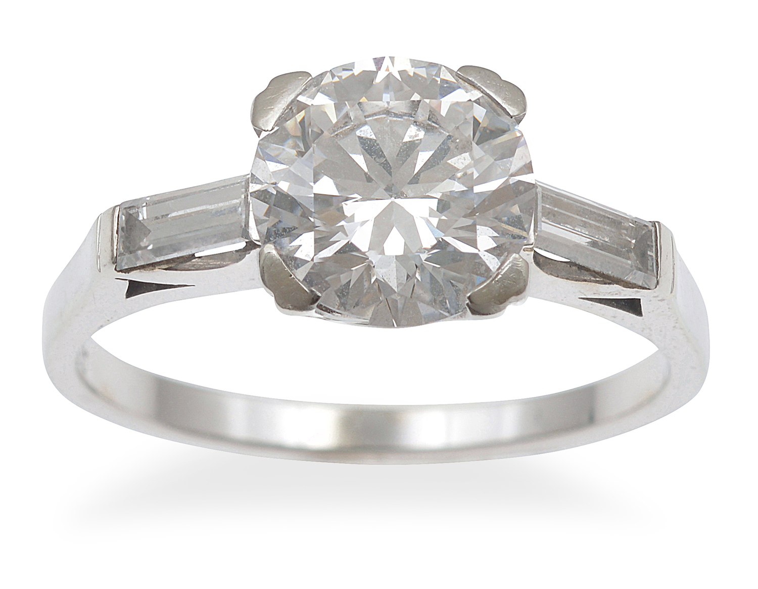 The round brilliant cut diamond of 1.67cts having baguette cut diamonds set to the shoulders totalling 0.30cts, all in 18ct white gold, ring size M-N.