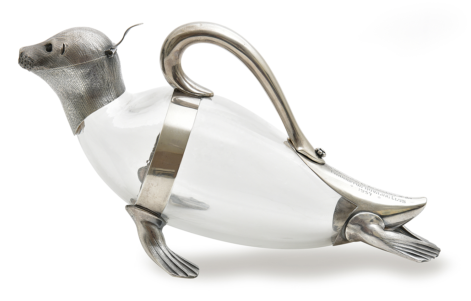 naturalistically modelled in the form of a seal, the head with glass eyes, the head hinges and forms the spout, with a silver scroll handle, flippers and tail, the latter inscribed ' PRESENTED TO / MAJOR GENERAL GRIMWADE / in appreciation by the members of the / FRANKSTON BOWLING CLUB / 1937' , 15cm high