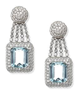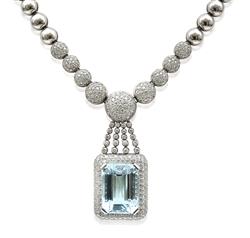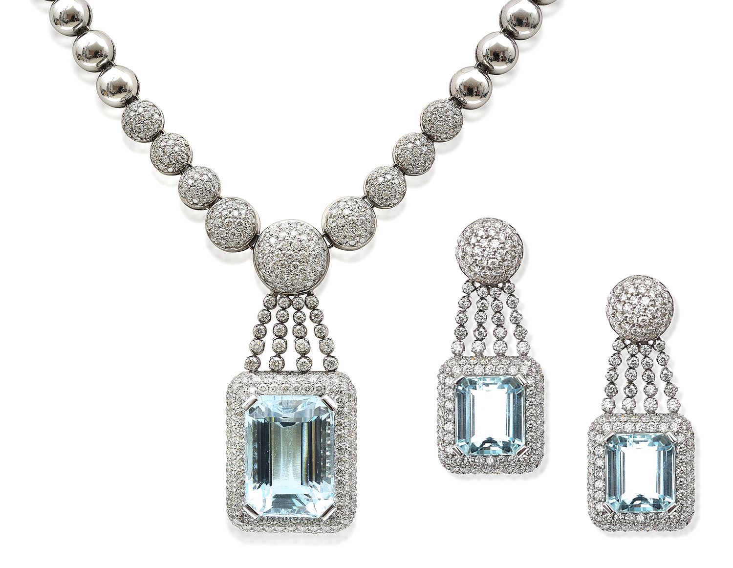 Comprising a necklace and pair of earrings, the necklace featuring a pendant drop set with an octagonal cut aquamarine of 22.50cts, surrounded and surmounted by grain set round brilliant cut diamonds totalling 3.48cts, suspended from a chain of graduated domed circular panels, nine pave set with diamonds totalling 2.56cts, the earrings of conforming design each having an aquamarine of 7.50cts and diamonds set throughout totalling 1.82cts, all mounted in 18ct white gold.