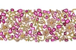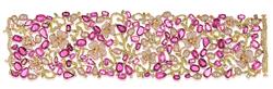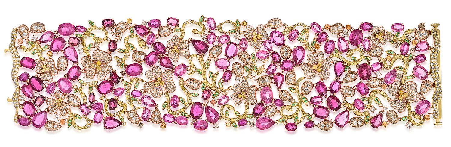 The wide pierced panel featuring mixed cut rubellite tourmalines totalling 71.50cts, offset by flowers and foliage set with white and coloured diamonds, having further gem set detail throughout of rubies and coloured sapphires, all mounted in 18ct gold, total length 200mm.