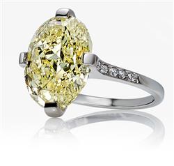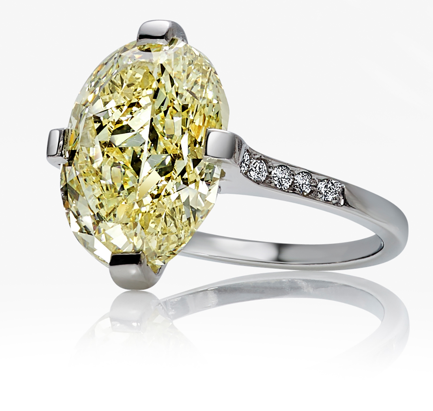 The natural fancy yellow oval brilliant cut diamond of 5.02cts with even colour distribution, four claw set with diamond detail to each shoulder, mounted in platinum, signed, ring size I, accompanied by original GIA certificate with matching laser inscription on girdle 5111245725, boxed.
