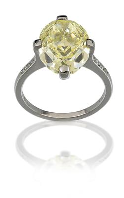 There are abrasions/chips to the girdle above on shoulder and below the GIA laser inscription, these do not appear on the original GIA certificate. The original GIA grades colour as natural fancy yellow, clarity SI1. Culet has been faceted as noted on GIA report. All diamonds secure in their settings. Inside of shank signed PB.