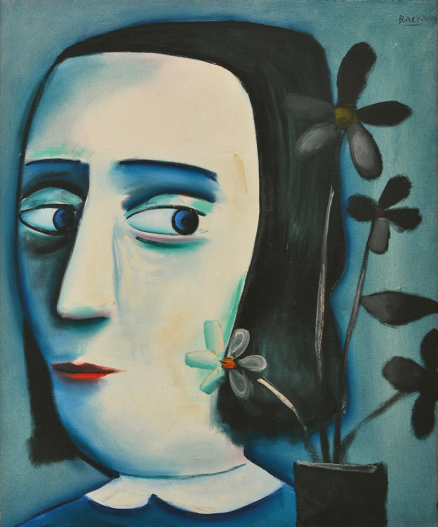 With its red daisy eye and rising stem, this curious flower seemingly acts as a signal to her red lips whose shapely double curve is mirrored in the Peter Pan collar of her blue dress. Like the schoolgirl hat in Blackman's first series of paintings, this collar then heads towards the simple pot on the picture plane that contains the elusive bouquet of whirling shapes on the periphery.