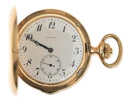 Crown wind lever set movement, circular white dial with black Arabic numerals, subsidiary seconds dial at six, signed case, dial and movement, 14ct gold case, case number 0968523, 55mm diameter.