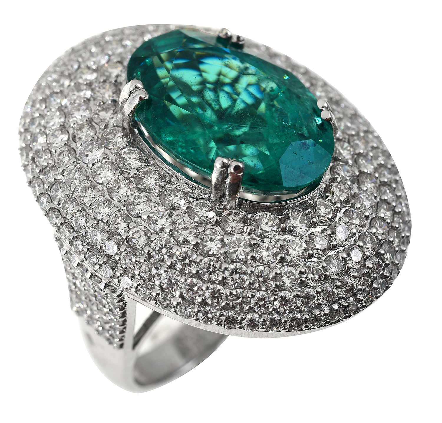 Centrally set with a oval brilliant cut emerald weighing 17.01cts, surrounded by pave set round brilliant cut diamonds totalling 7.03cts, mounted in 18ct white gold, ring size P.