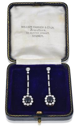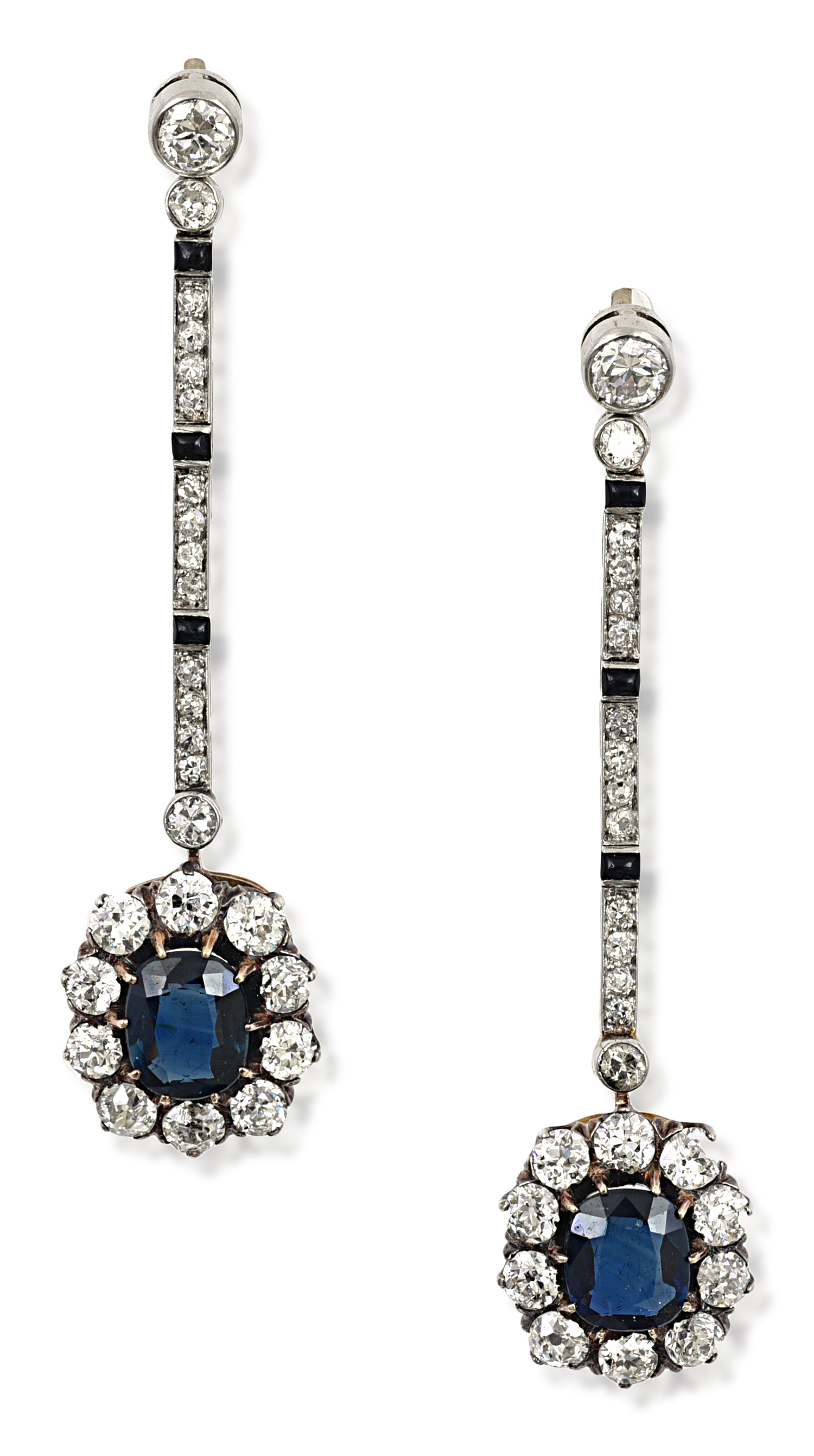 In very good condition. The drop is a later marriage to the diamond and onyx drop section which is in platinum. Settings show evidence of jewellers work to modify. Sapphires weighing 0.88cts and 1.05ctsn respectively. Gems in cluster mounted in 15ct rose gold. Ten surrounding old European cut diamonds measure approx.. 3.0mm totaling 1.20cts each. Principal transition brilliant cut diamond at top measures 4.1mm totaling 0.26cts each. Having threaded post fitting. The top of the setting is from the 1920's and the cluster is late 19th century.