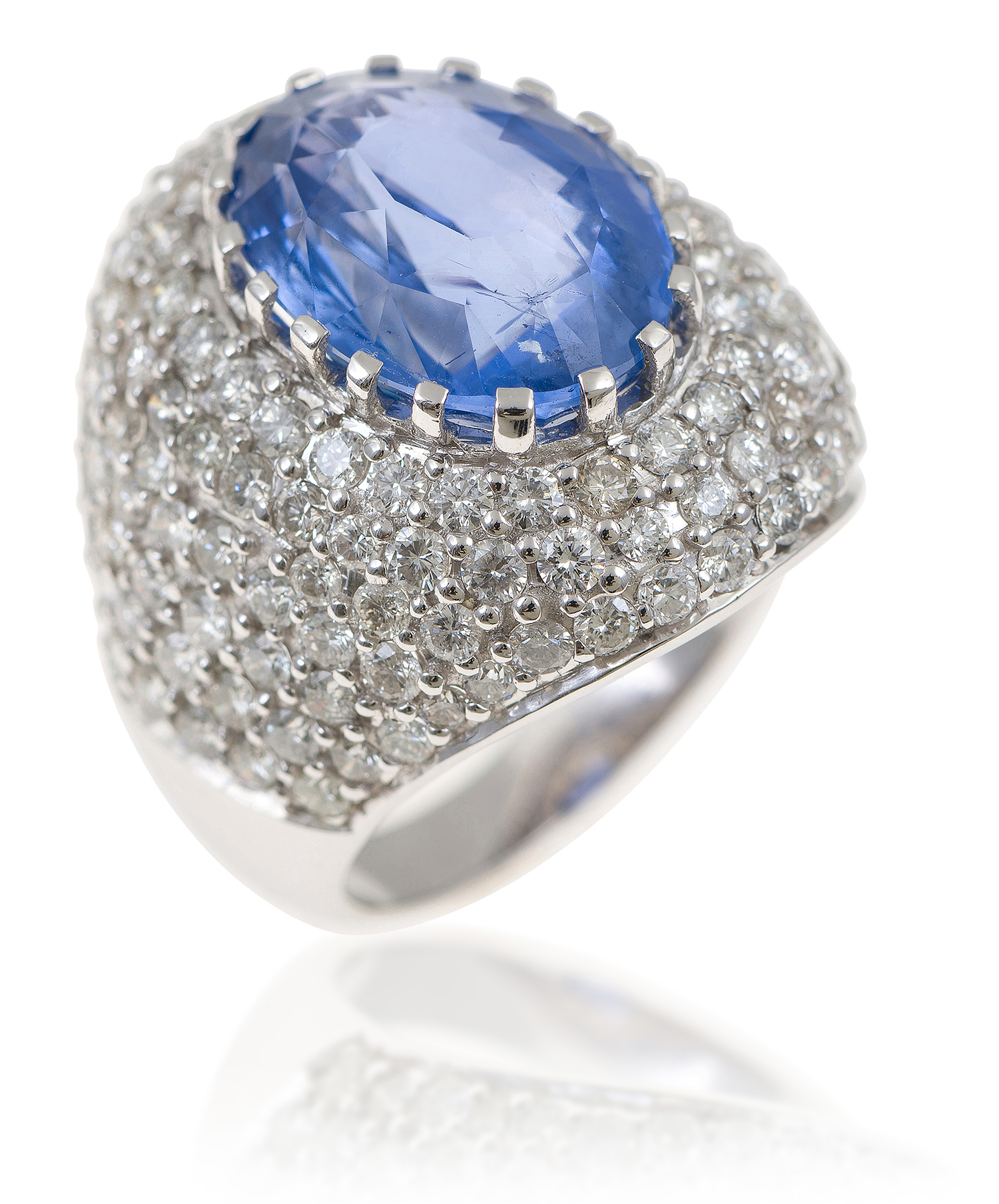 Centrally set with an oval sapphire of 12.26cts to a domed pave diamond surround, mounted in 18ct white gold, ring size O, accompanied by a GSL gemstone report stating no evidence of heat treatment detected.