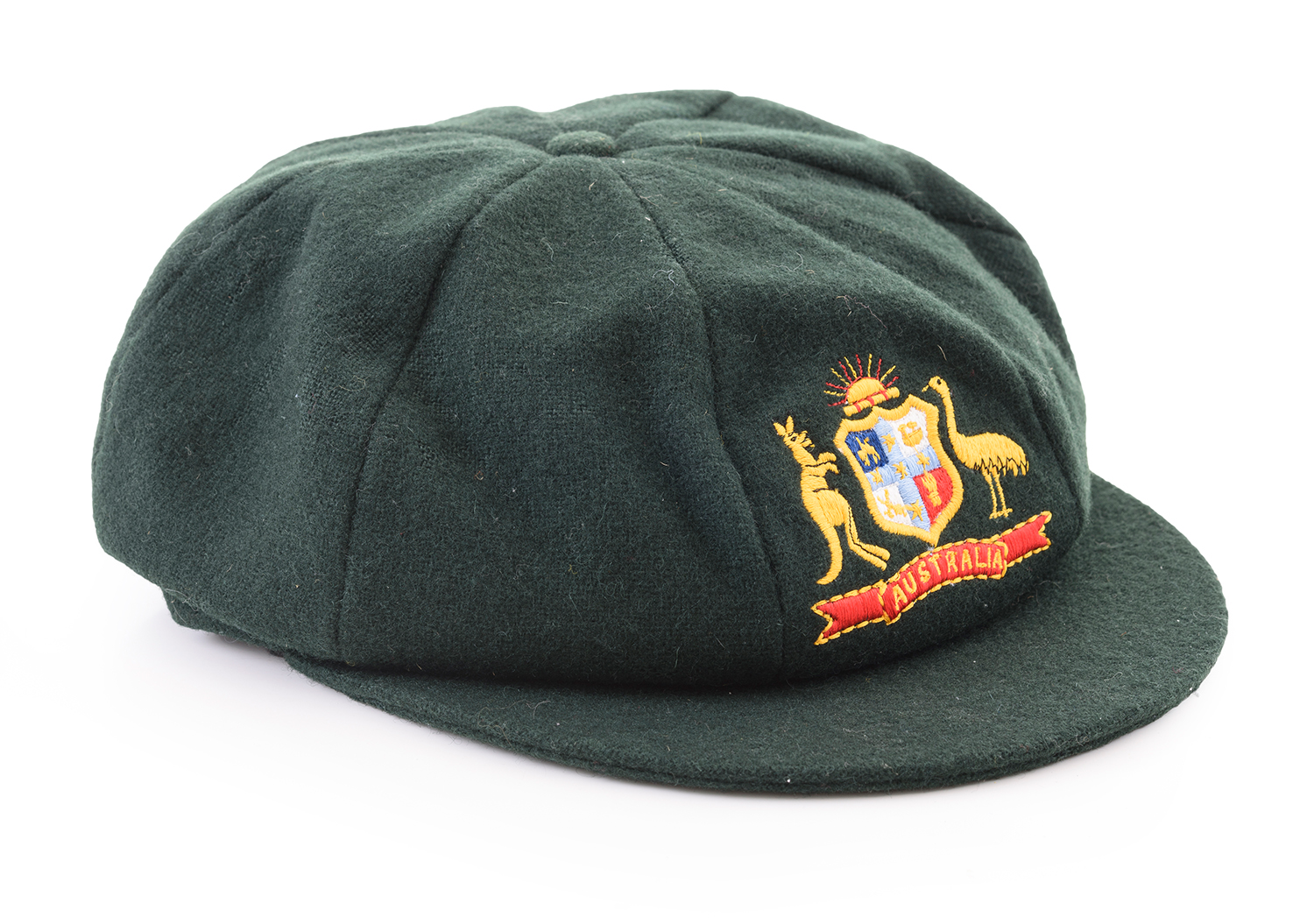 DENNIS LILLEE'S "BAGGY GREEN" AUSTRALIAN TEST CAP, GREEN WOOL, EMBROIDERED AUSTRALIAN COAT-OF-ARMS ON FRONT, ENDORSED INSIDE "DKL". GOOD MATCH-USED CONDITION. EX RODNEY HOGG COLLECTION.