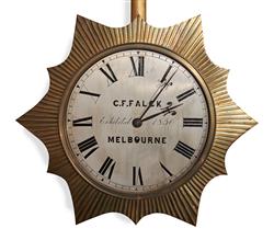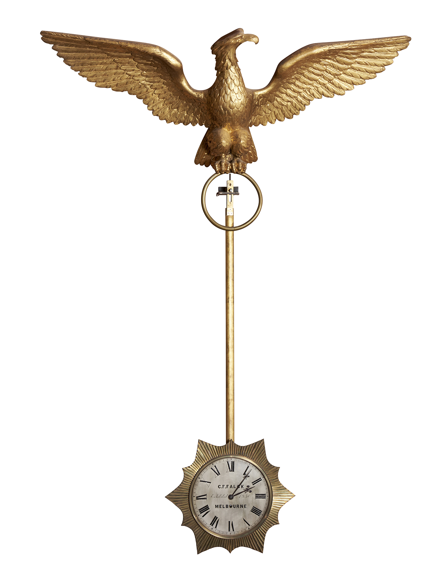 The silvered dial signed C. F .Falck- Melbourne- Exhibited Melbourne 1856, within a reeded gilt brass sunburst surround. The whole suspended by a carved gilt wood eagle with outstretched wings. Eight day fusee movement with dead beat escapement wound from the front.