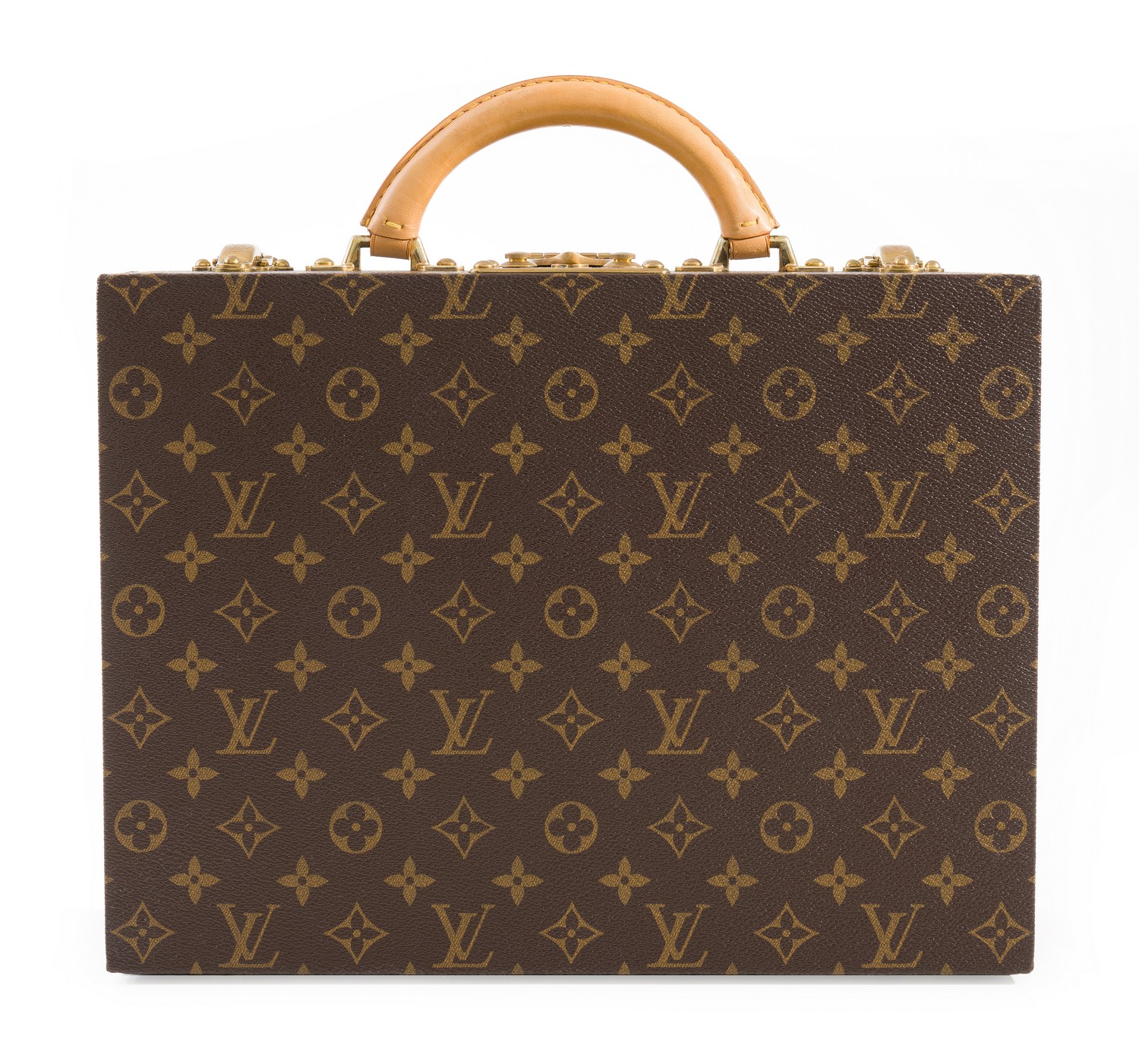 Styled in monogram leather with gold metal hardware, tan leather handle and velvet interior, M20076,