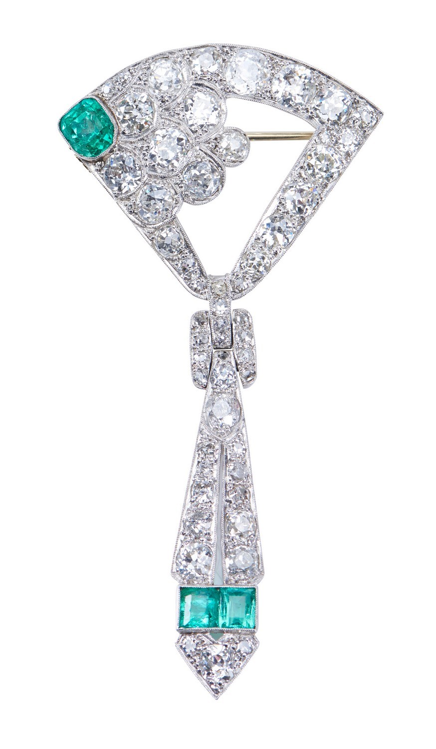 The open fan shaped plaque and articulated ribbon drop, set with old European cut diamonds totalling 9.50cts, with emerald detail totalling 2.25cts, in platinum.
