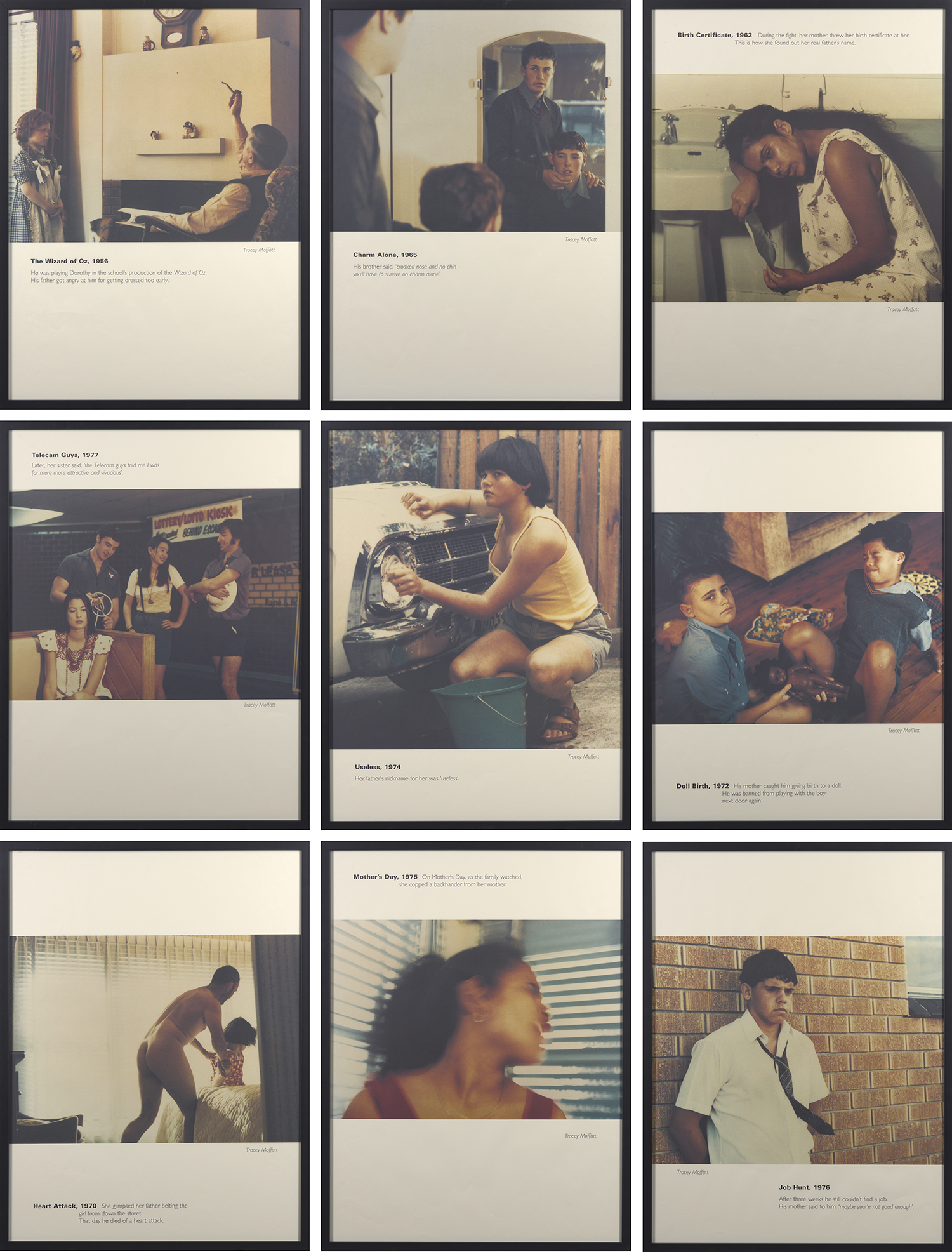 Widely exhibited in major international exhibitions, Scarred for Life is a series that reinforced Tracey Moffatt's reputation as one of the most significant Australian contemporary artists of our time. In an interview with Gerald Matt, Moffatt describes the Scarred for Life series thus: "I have integrated rather ordinary washed out colour compositions with text describing the scene. I was inspired by looking at 1960s American Life magazine layouts. A kind of snapshot photography - very everyday moments based on real life tragic funny child-hood stories of my friends and myself. I felt that this was the only way to keep power in the image - to be ordinary, it does resonate. People remember the little boy giving birth to the doll. I could have shot this in a more clever dramatic way but in the end it had to be like a scene one would see as they passed and glanced in the living room door. In the case of this picture it means mother's point of view.