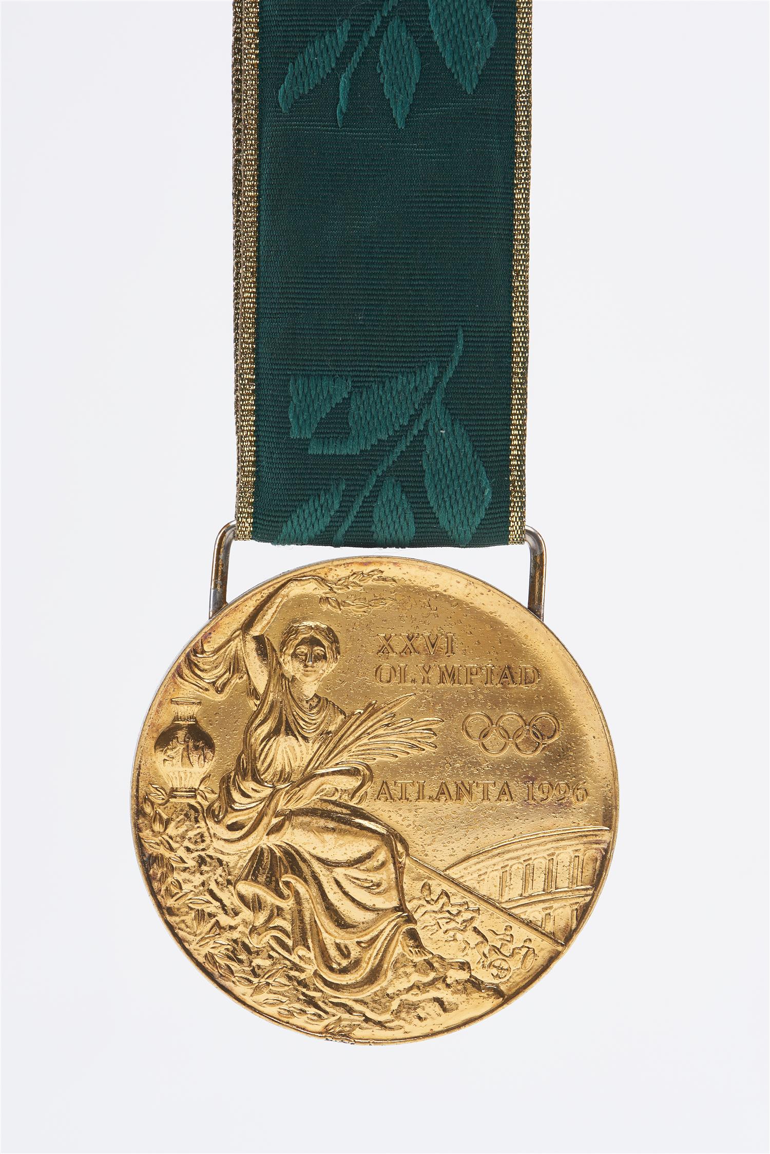 On the reverse, the official emblem of the 1996 Games and the 'Quilt of Leaves' design. For each sport, the medals awarded to the athletes were minted with the addition of the relevant sport's pictogram positioned in the centre of the 'Quilt of Leaves'.