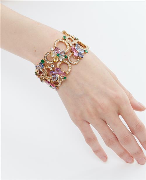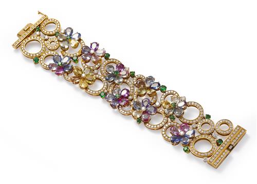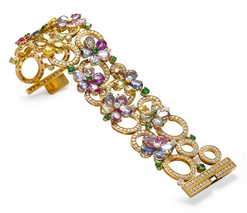 Modelled as a wide strap comprising of lines of flower heads each centring a brilliant-cut diamond stamen within a surround of petals claw-set with variously coloured pear-shaped sapphires framed by symmetrical openwork annular motifs, pavé-set with brilliant-cut diamonds decorated at intervals with articulated claw-set diamonds and circular-cut emeralds, completed by a similarly set box clasp, the sapphires, emeralds and diamonds together stated to weigh 77.46 carats, 3.03 carats, and 7.36 carats respectively, length approximately 185mm, signed Bulgari.
