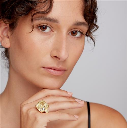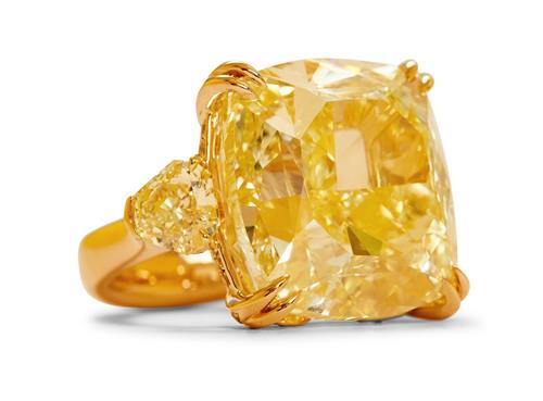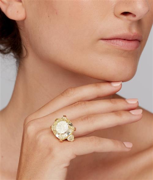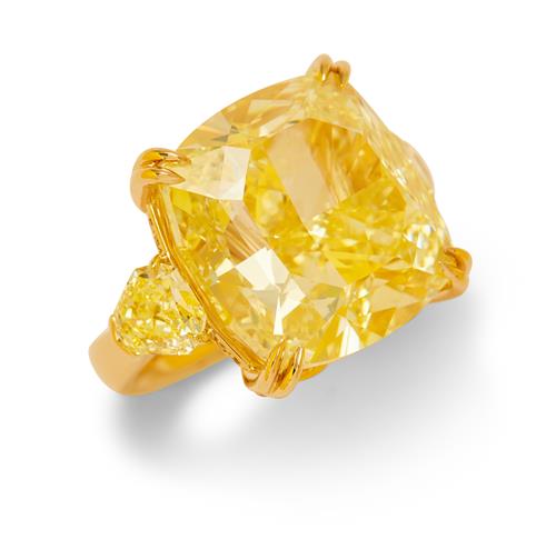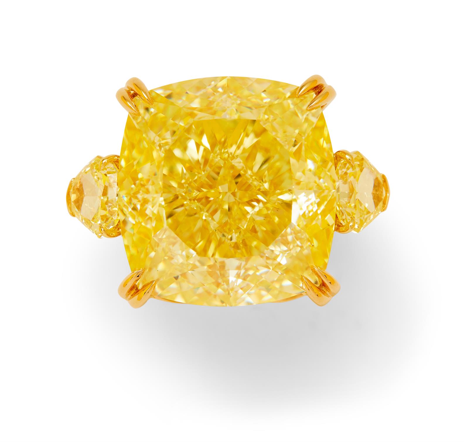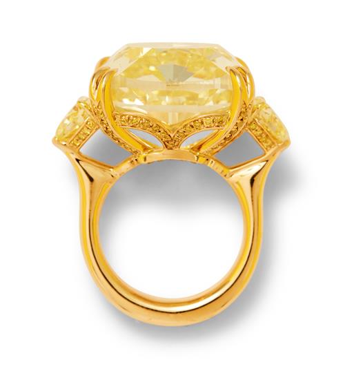 The natural fancy yellow cushion modified brilliant-cut diamond weighing 41.71 carats is claw-set between a pair of fancy yellow modified shield brilliant-cut diamonds together weighing 2.40 carats, the gallery and under rail pavé-set with natural fancy yellow brilliant-cut diamonds together weighing 0.55 carats, mounted in 18ct gold, size L1/2.