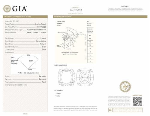 a GIA report numbered 2223112653, dated 2 November 2021, stating that the 41.71 carat diamond is natural, fancy yellow colour, VVS1 clarity, laser inscribed;
