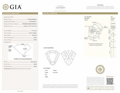 a GIA report numbered 6167306311, dated 6 August 2014, stating that the 1.19 carat diamond is natural, fancy yellow colour, VVS2 clarity.