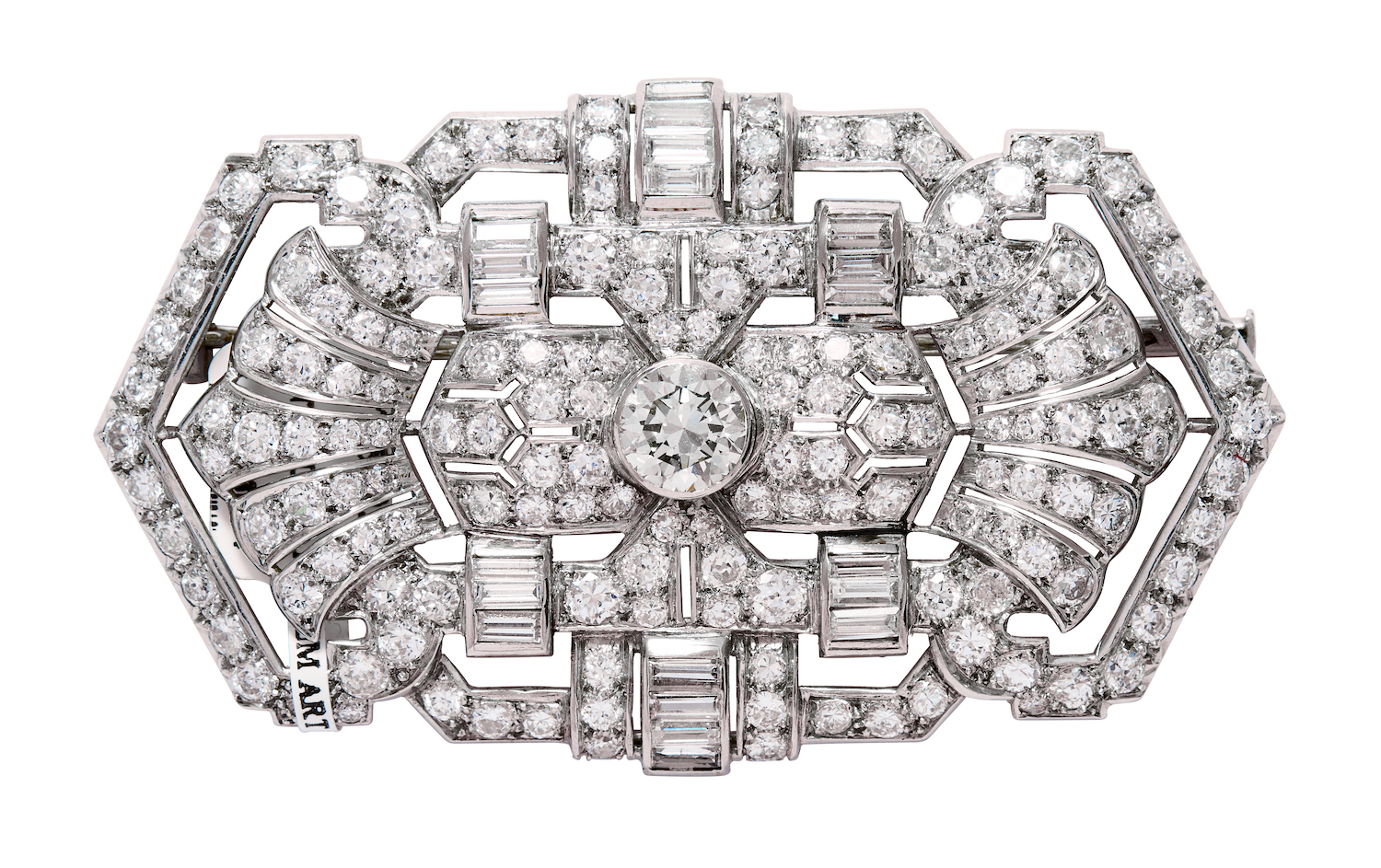 The openwork plaque brooch of buckle design, centring a bezel-set transitional brilliant-cut diamond weighing approximately 1.25 carats, upon a symmetrical geometric surround set throughout with channel-set baguette diamonds and millegrain bead-set round brilliant-cut diamonds together weighing approximately 1.60 carats and 6.54 carats respectively, mounted in platinum, length 65mm, width 37mm, total gross weight approximately 26 grams, maker's mark.