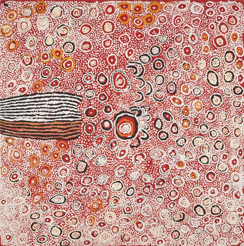"This painting depicts designs associated with the rock hole and soakage water site of Marrapinti, to the west of the Pollock Hills in Western Australia.