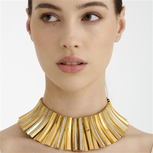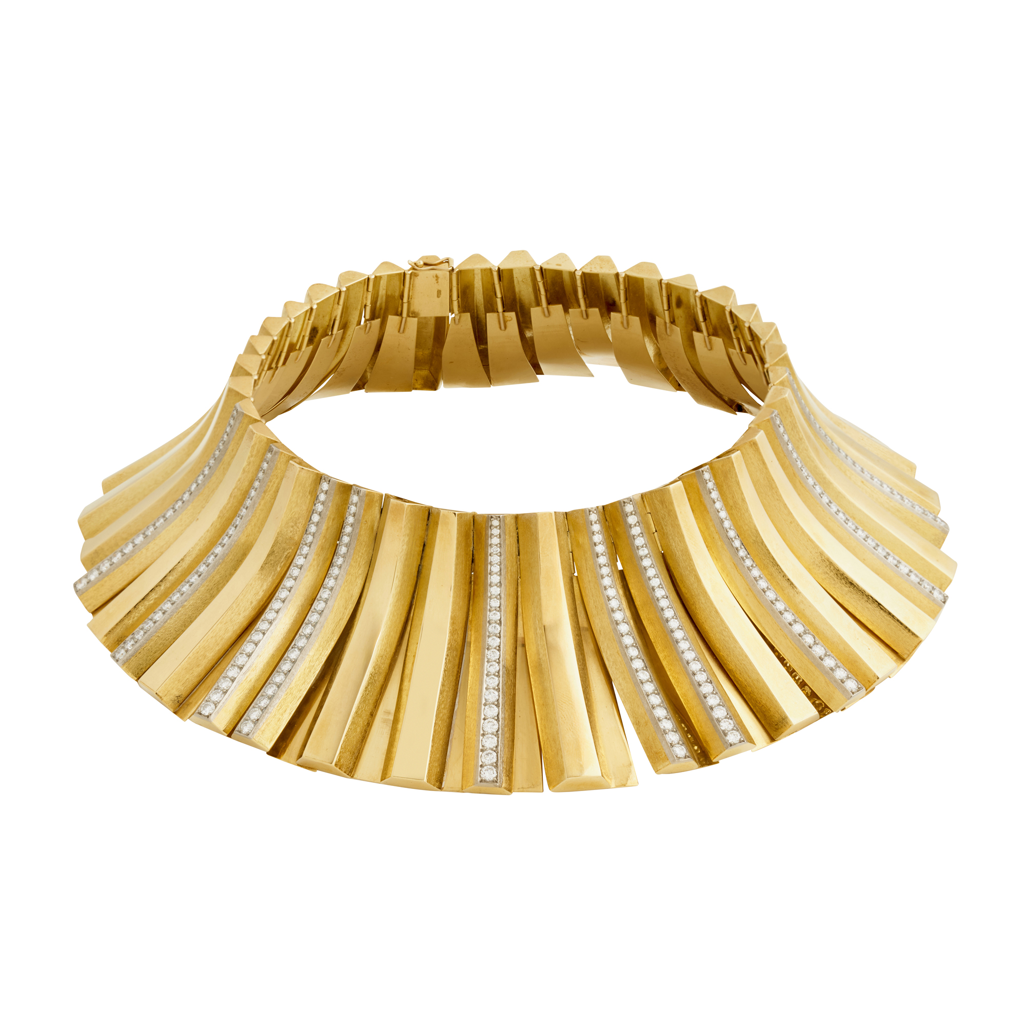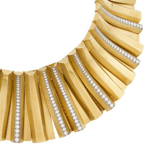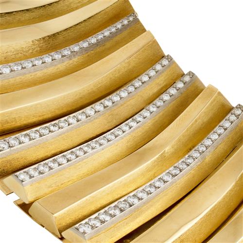 Comprised of a series of articulated curved panels, ten of the panels detailed with graduating claw-set round brilliant-cut diamonds, the diamonds together weighing approximately 6.50 carats, completed by a concealed tongue and groove clasp, inner circumference 340mm, gross weight approximately 316.0 grams.