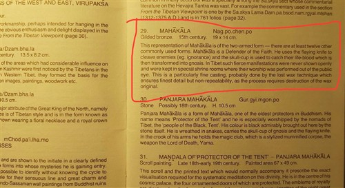 Panjarnata Mahakala is frequently, though not invariably, depicted balancing a baton (Gandhi) in the crooks of his arms-a feature from which all other manifestations of Mahakala are believed to originate. Nonetheless, even in the absence of the baton, the deity's single face and two-armed wrathful form, wielding a kartri (ritual chopper) and kapala (skull cup), clearly identifies him as Panjarnata Mahakala, the revered "Lord of the Pavilion." He serves as the principal protector of the Hevajra Tantra cycle within the Sakya School, and his iconography and ritual practices are documented in Chapter 18 of the Vajra Panjara Tantra, as well as Chapters 25 and 50 of the Mahakala Tantras.