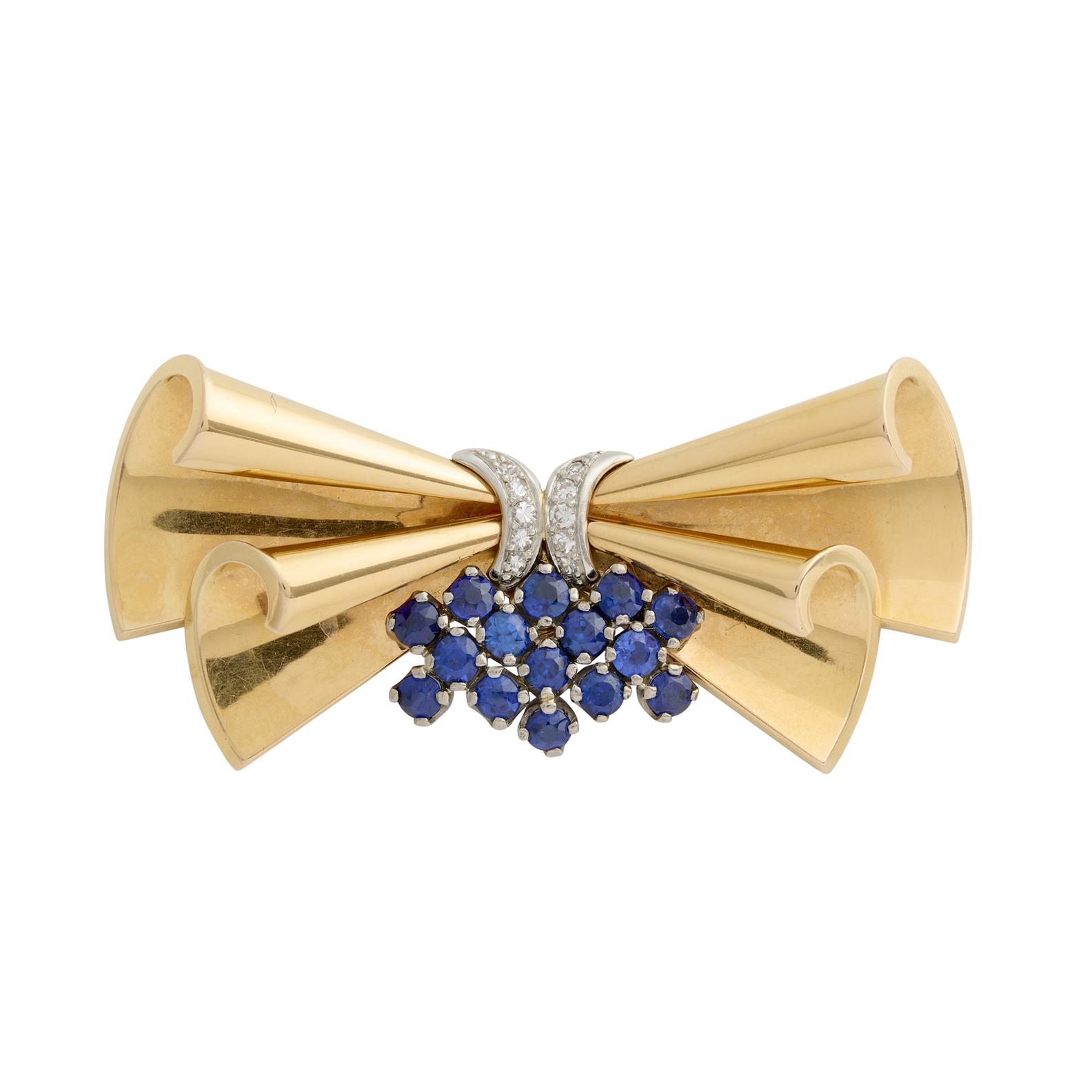Modelled as a stylised bow, claw-set to the centre with sapphires, the sapphires together weighing approximately 2.85 carats, embellished with diamonds, mounted in 18ct gold, length 30mm, length 63mm, gross weight 20.4 grams, signed Prouds.
