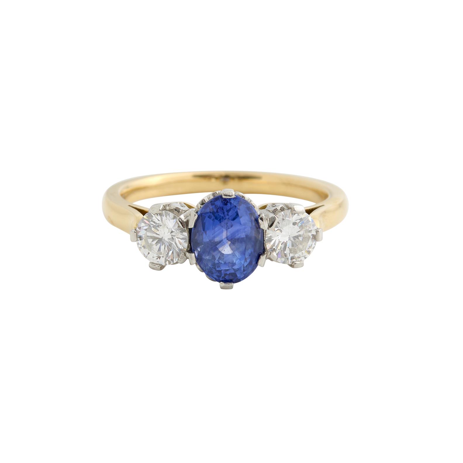 Centring a claw-set oval sapphire weighing approximately 1.35 carats, flanked with a similarly set brilliant-cut diamond, the diamonds together weighing approximately 0.54 carats, mounted in 18ct gold and platinum, size K1/2, gross weight approximately 3.9 grams, signed Kalmar.