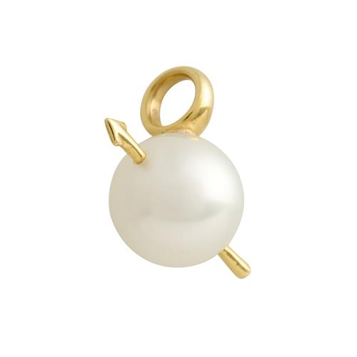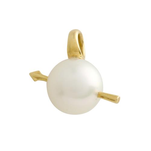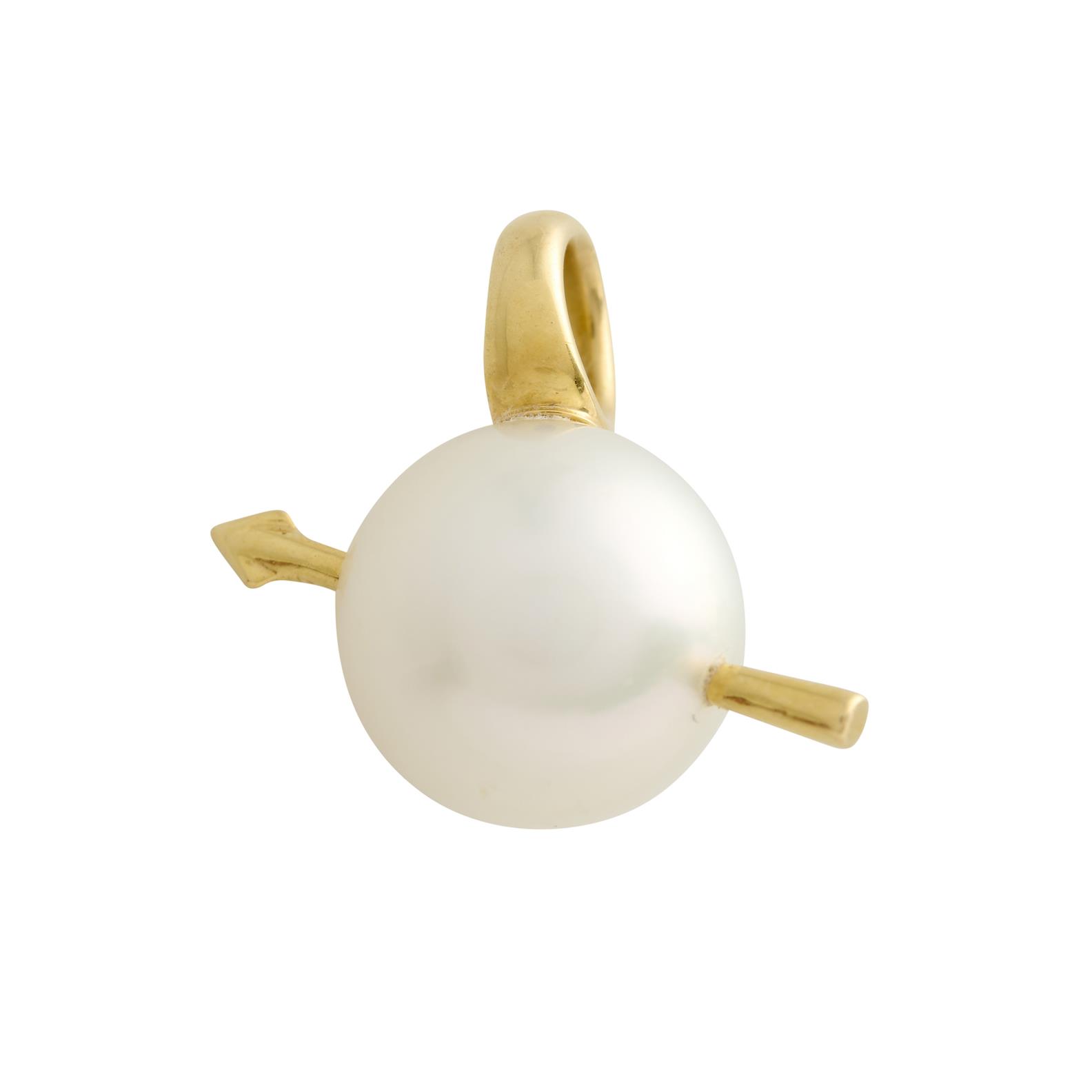 The 12.8mm off-round South Sea pearl is intercepted with an arrow, surmounted by a gold hoop, mounted in 18ct gold, length 20mm, gross weight approximately 4.3 grams, maker's mark for Paspaley.