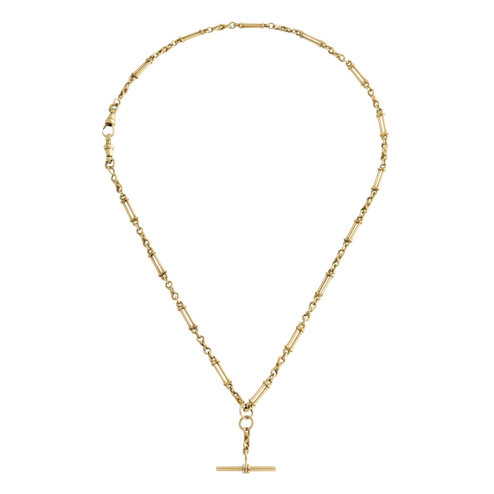 Of fancy link design, terminating in a T-bar, mounted in 9ct gold, inner circumference 510mm, gross weight approximately 20.4 grams.
