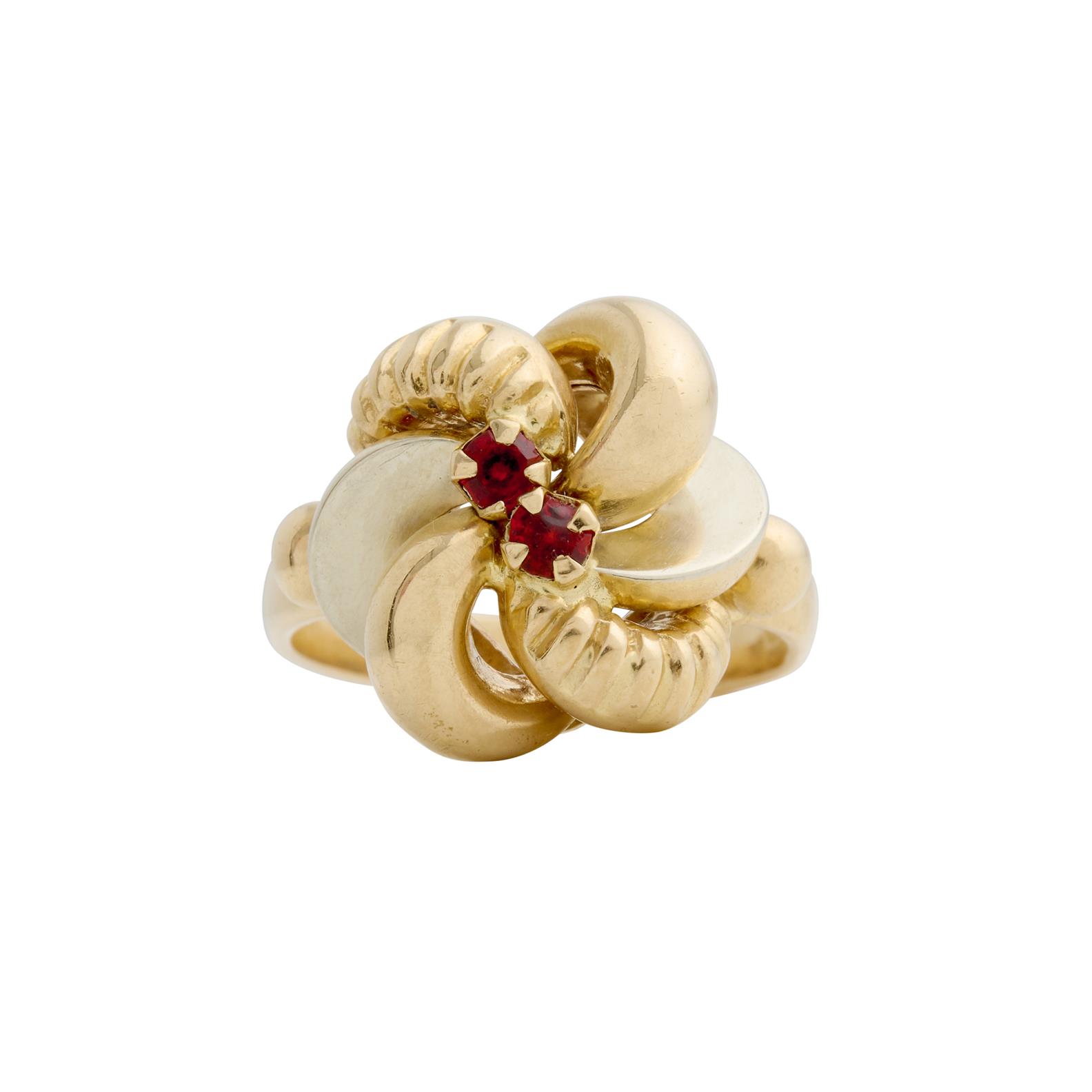 Of pinwheel design, set with two orange stones, size O, gross weight approximately 7 grams.