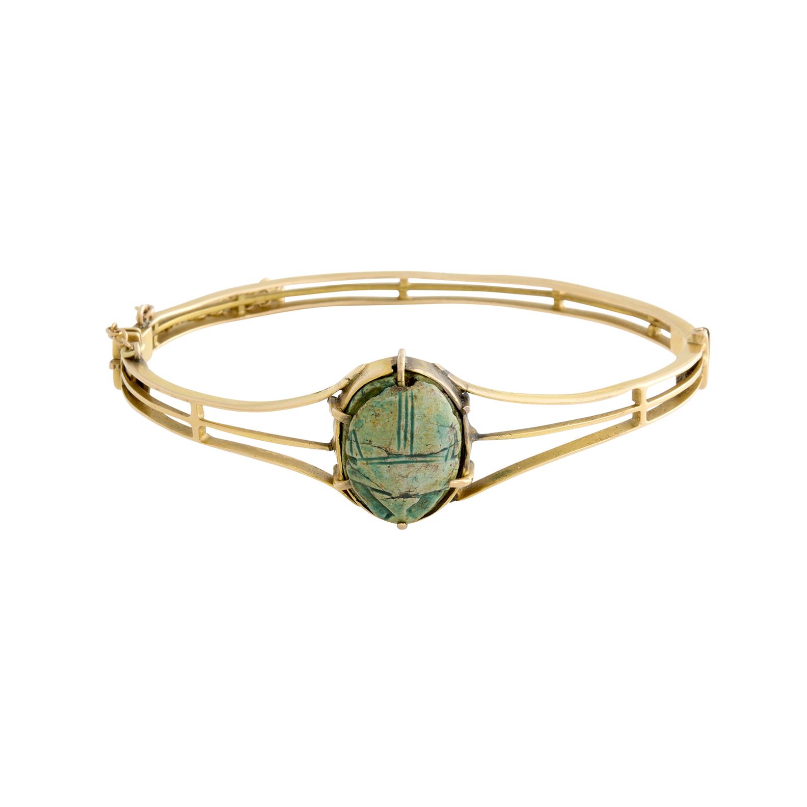 The oval hinge bangle is set to the front with a claw-set carved scarab beetle, mounted in 15ct gold, inner diameter 55mm, gross weight approximately 13.1 grams.