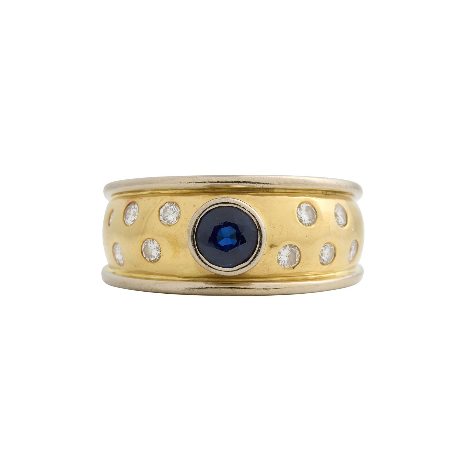 Centring a collet-set circular-cut sapphire weighing approximately 0.70 carats, to shoulders embellished with brilliant-cut diamonds, the diamonds together weighing approximately 0.23 carats, mounted in 18ct two-tone gold, width 10.2mm, size T1/2, gross weight approximately 13 grams.