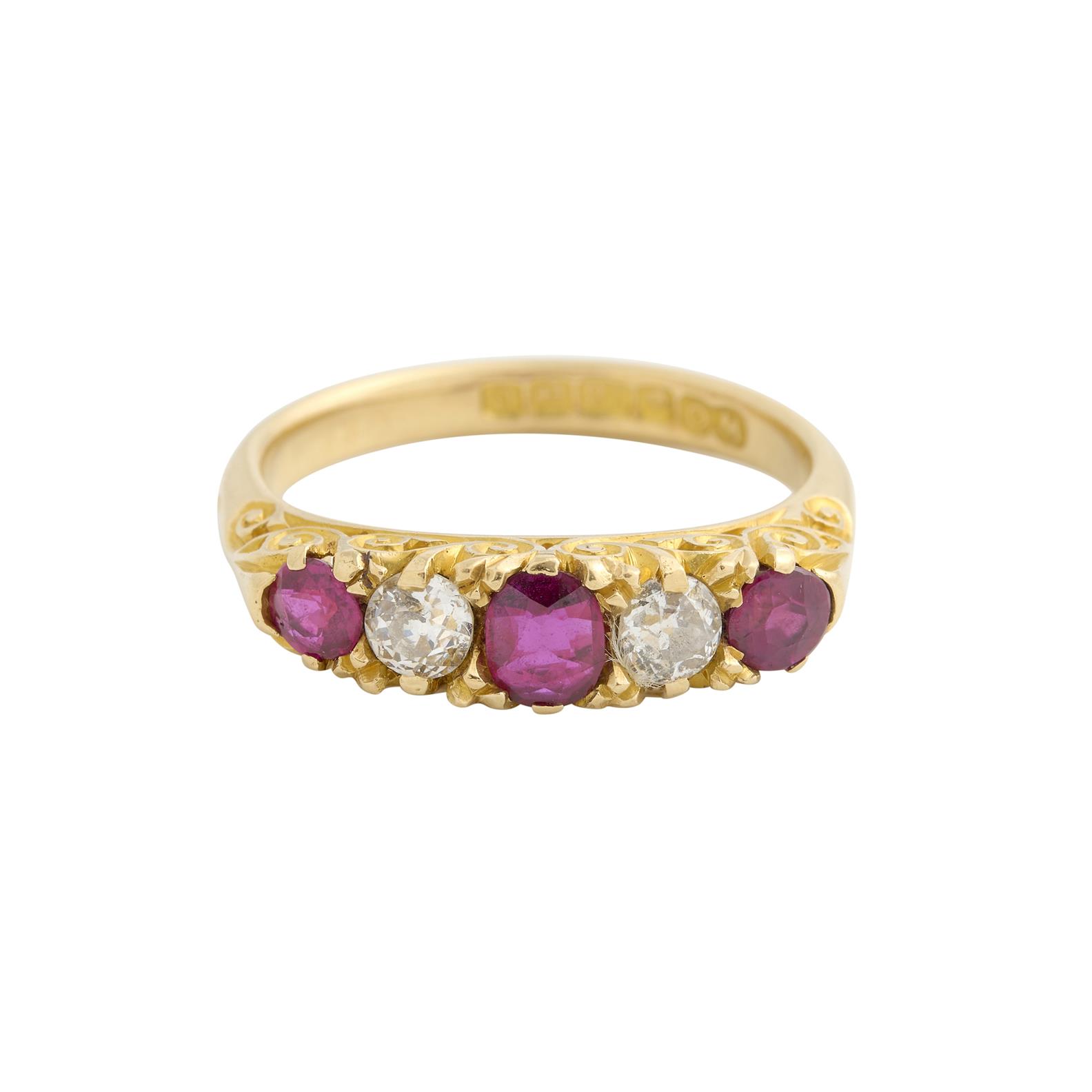 Composed as a line of claw-set oval and circular-cut rubies, alternated between similarly set old-European cut diamonds, the rubies and diamonds together weighing approximately 0.78 carats and 0.39 carats respectively, mounted in 18ct gold, size O1/2, gross weight approximately 5 grams, Birmingham assay marks.