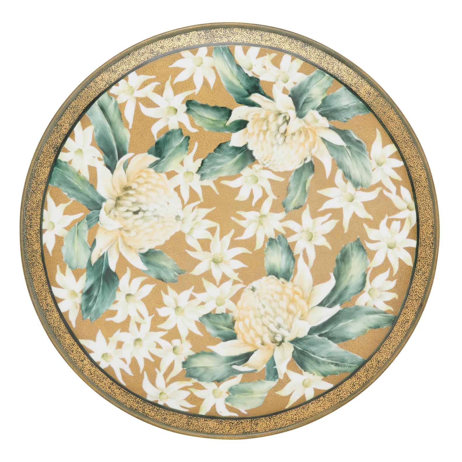 Slightly convex and circular, decorated with waratahs and flannel flowers on a gold ground.