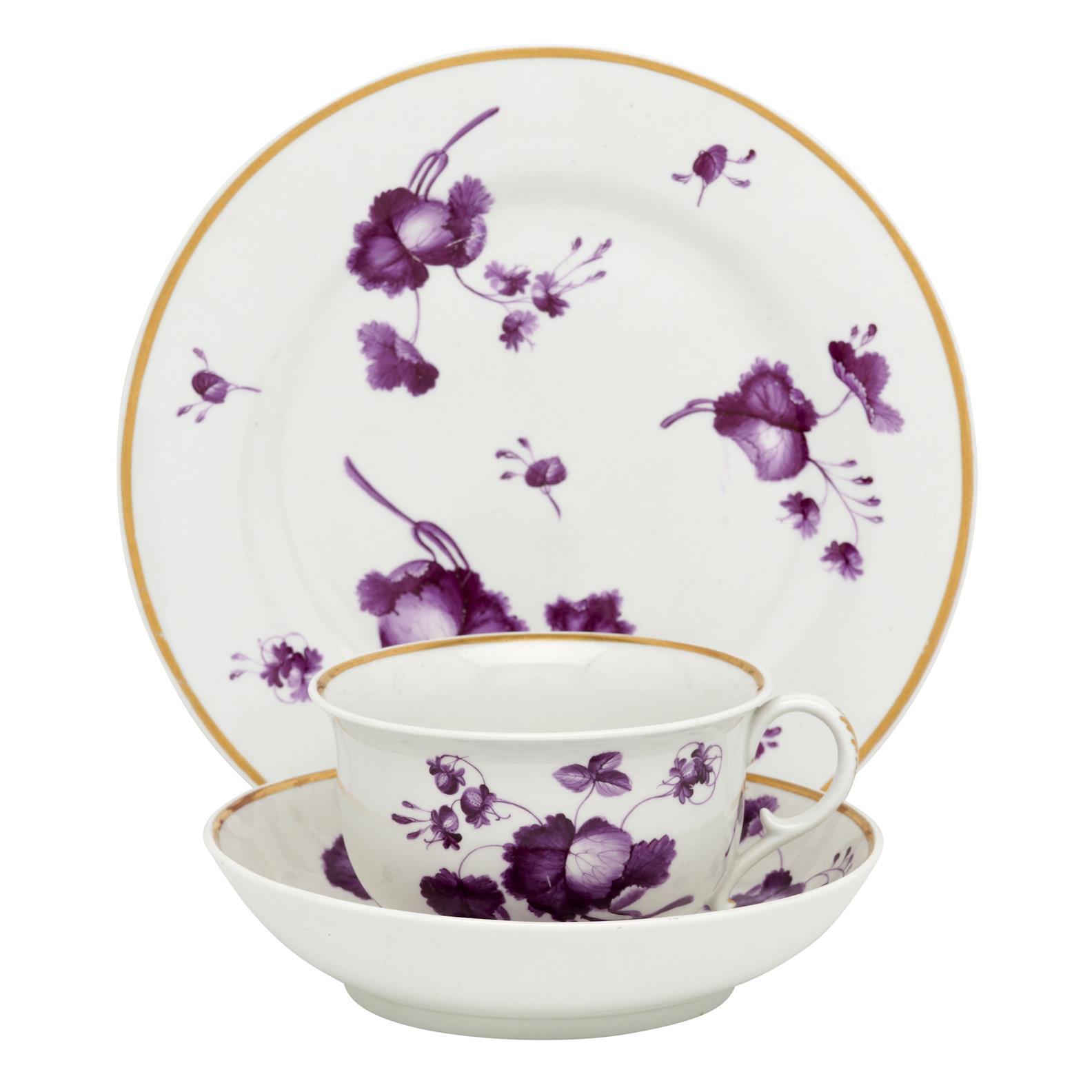 Decorated with puce flowers and leaves and a gold band on the rim.