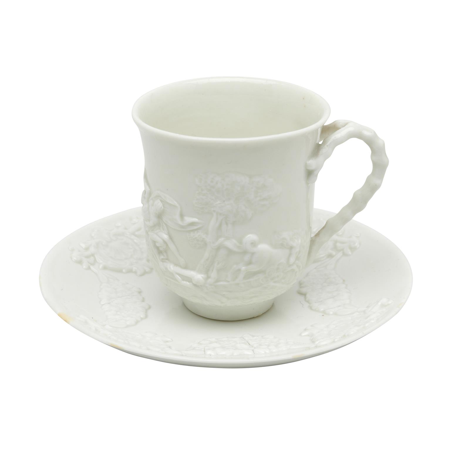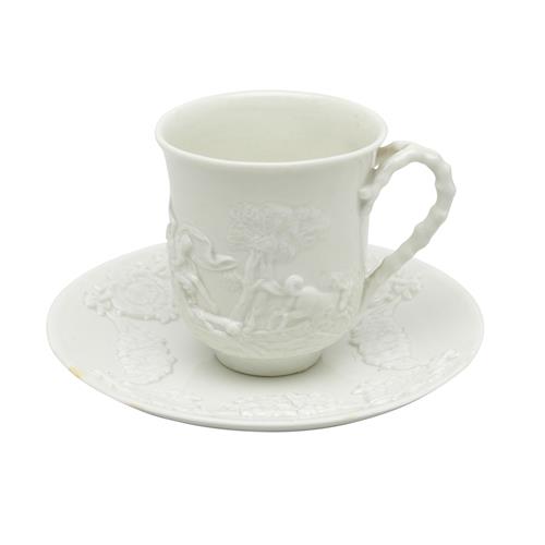 Decorated in the Baroque style with basso relievo istoriato moulding with figures of classical gods around the cup, the saucer with the similar moulded swags and shell motifs the handle a rustic branch